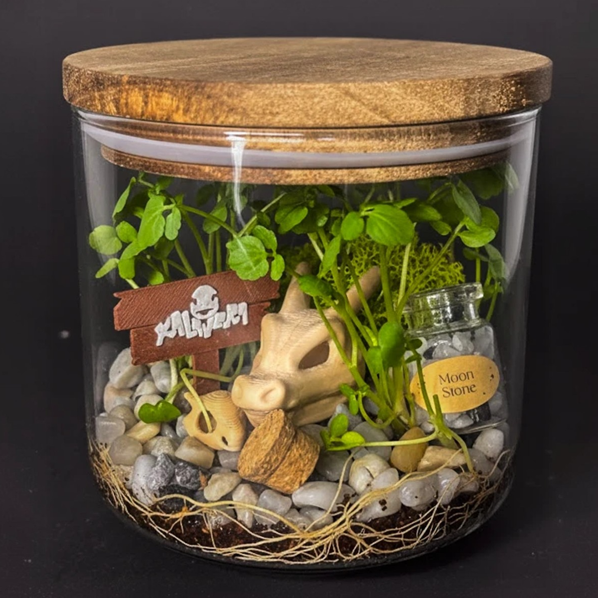 Crea tu propio ekosistema cerrado con este terrario de cristal de 10×10×10 cm y tapa de madera hermética, diseñado para mantener la humedad y permitir el crecimiento natural de las plantas. Un proyecto creativo, decorativo y perfecto para fans de Pokémon y del estilo Kalavera.